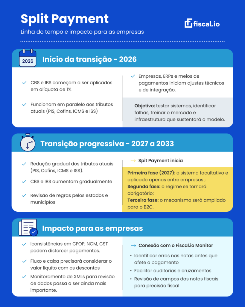 Abaixo preparamos um resumo visual do cronograma e impactos do Split Payment e Reforma Tributária. Espero que seja útil para você!