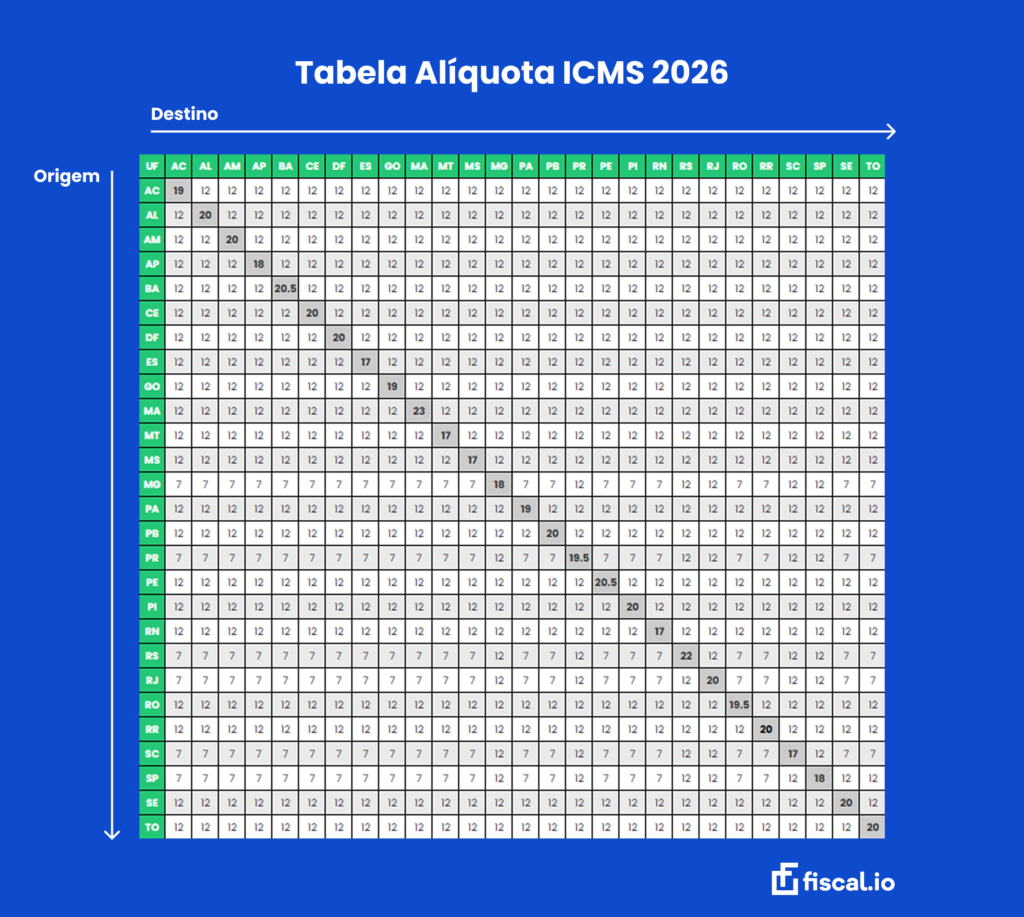 Ou seja, é a tabela ICMS 2026 que vai te guiar ao entender o que será cobrado da sua empresa nas operações com base no origem e destino da prestação de serviço.